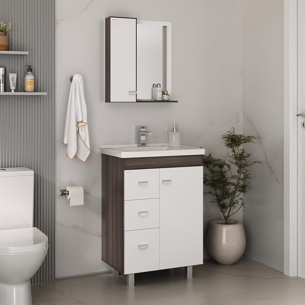 O Conjunto Marcela foi desenvolvido para unir funcionalidade e estilo em banheiros compactos. Conta com três gavetas — sendo a última mais profunda — e uma porta com prateleira interna, oferecendo excelente aproveitamento do espaço e organização prática. O conjunto acompanha lavatório em mármore sintético e espelheira com porta, espelho amplo e prateleira externa, agregando ainda mais utilidade e elegância ao ambiente.