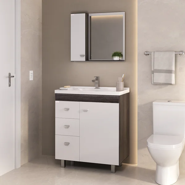 O Conjunto Marcela foi desenvolvido para unir funcionalidade e estilo em banheiros compactos. Conta com três gavetas — sendo a última mais profunda — e uma porta com prateleira interna, oferecendo excelente aproveitamento do espaço e organização prática. O conjunto acompanha lavatório em mármore sintético e espelheira com porta, espelho amplo e prateleira externa, agregando ainda mais utilidade e elegância ao ambiente.