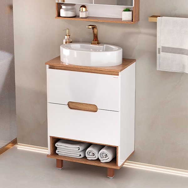 O Gabinete para Banheiro Beatriz da Fabribam combina praticidade e elegância. Com 60 cm de largura, possui duas gavetas amplas, um nicho funcional e pés com regulagem de altura, garantindo mais estabilidade e adaptação ao ambiente. Sua frente e laterais recebem pintura UV, proporcionando um acabamento sofisticado e durável.